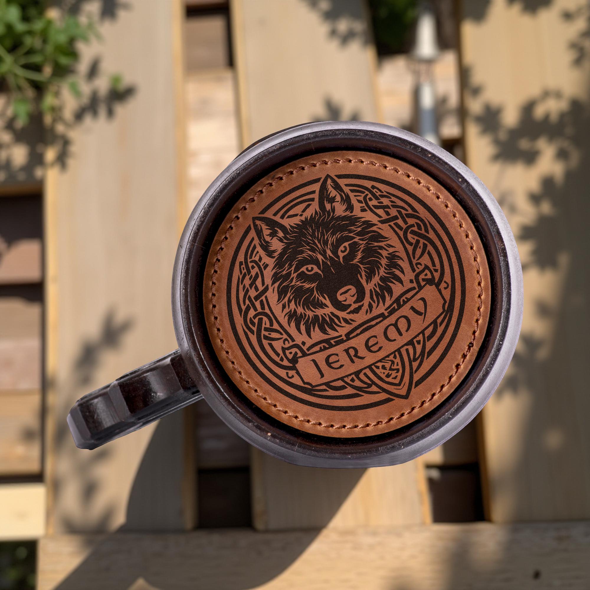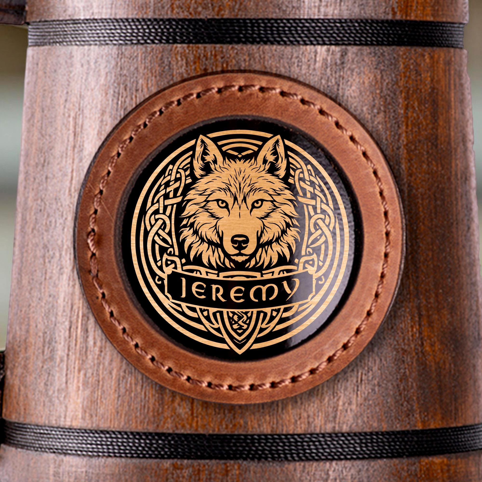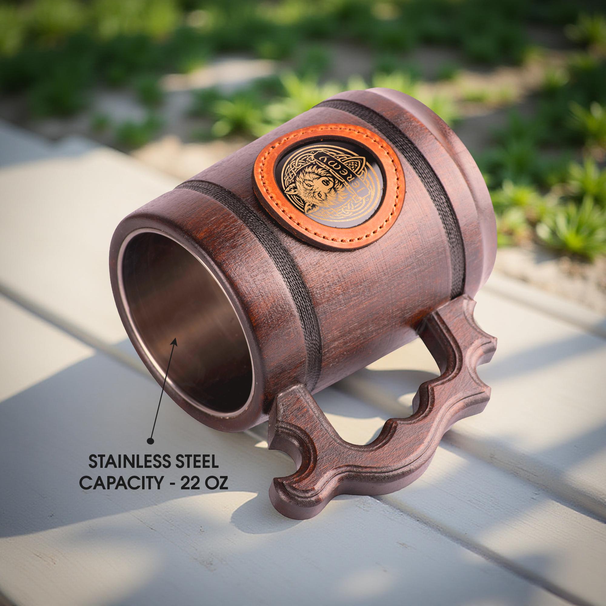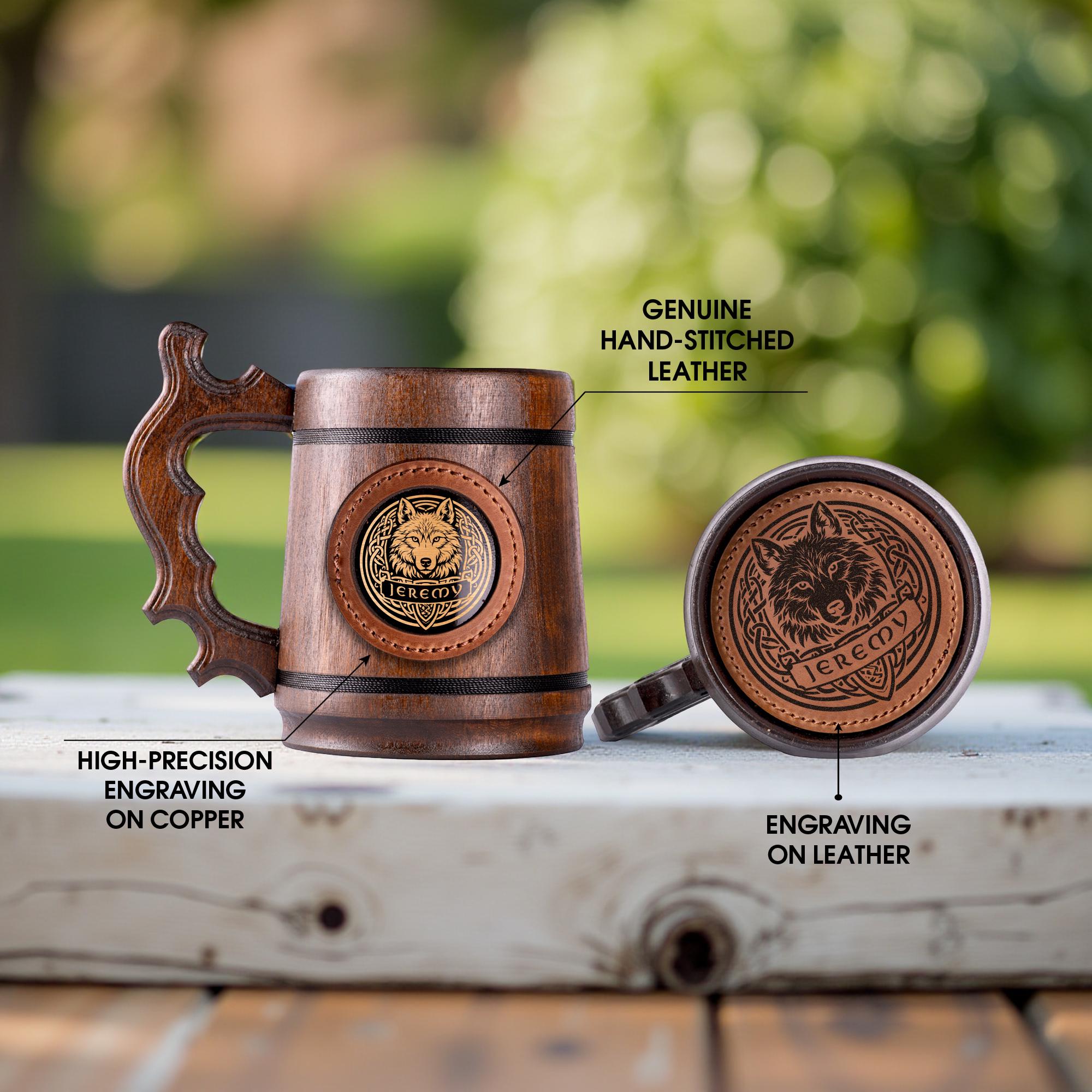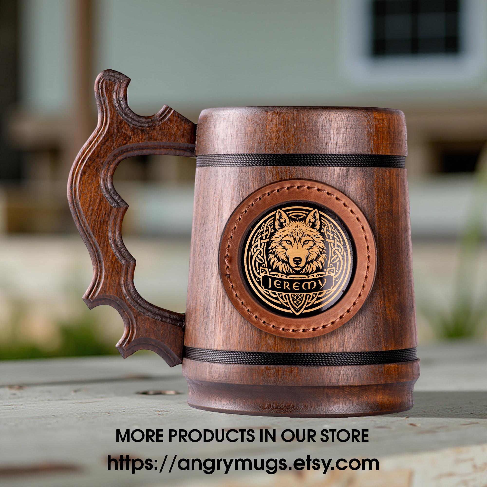 Personalized Wolf Beer Mug, Handmade Wooden Oak Tankard, Celtic Knot Engraved