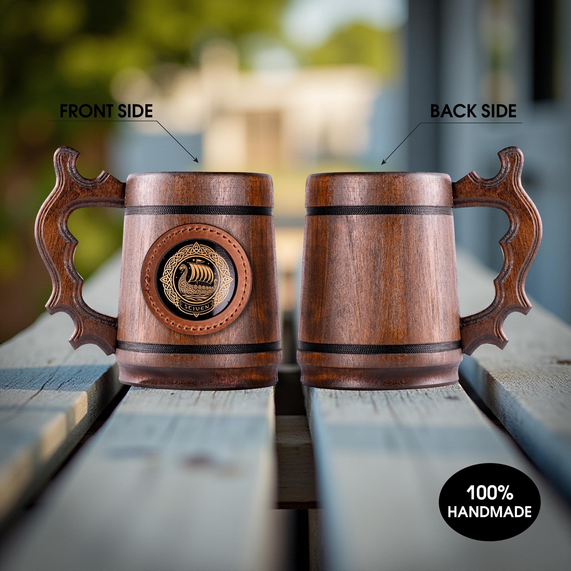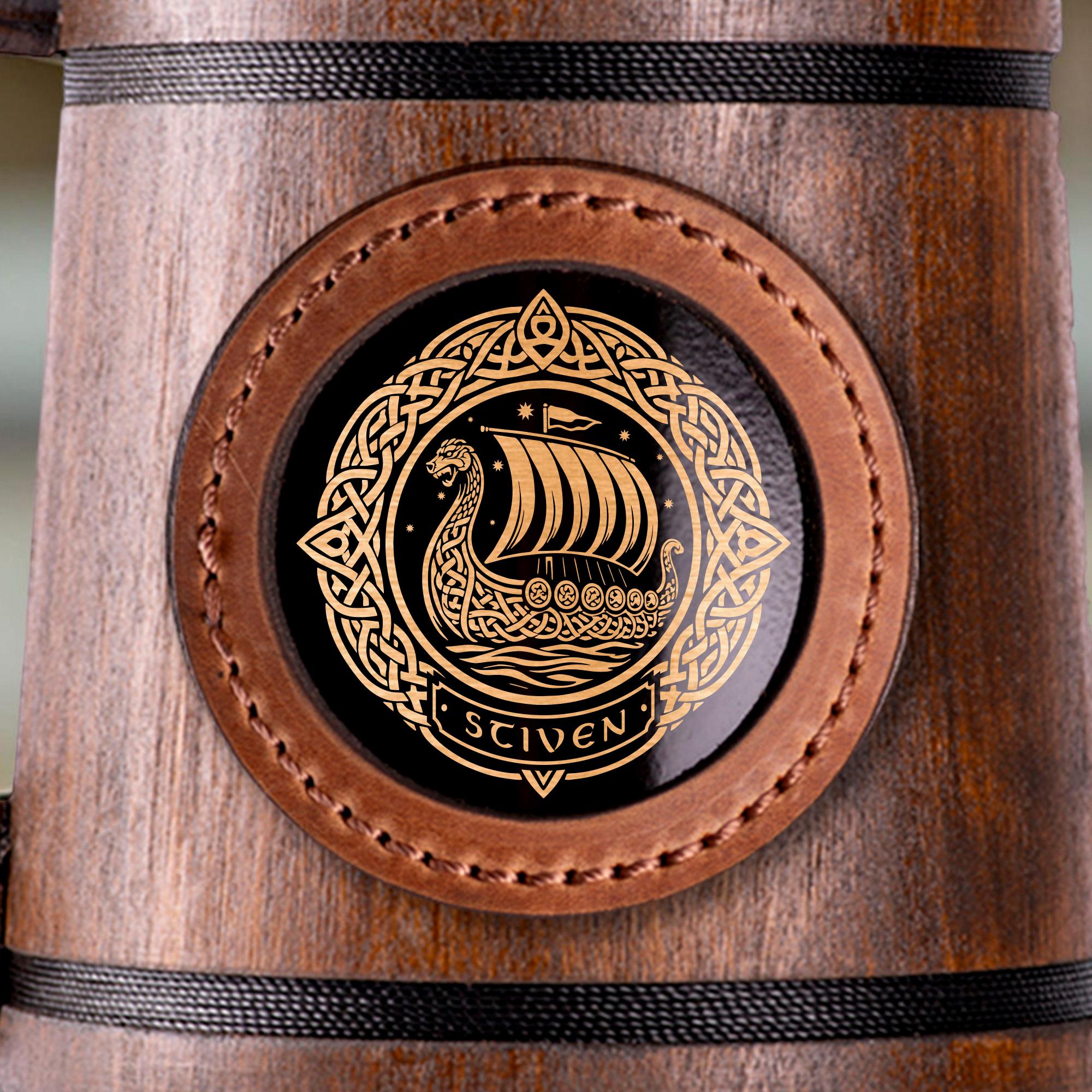 Personalized Oak Beer Mug in Nordic Style with Engraving of a Viking Ship - Drakkar, Handmade