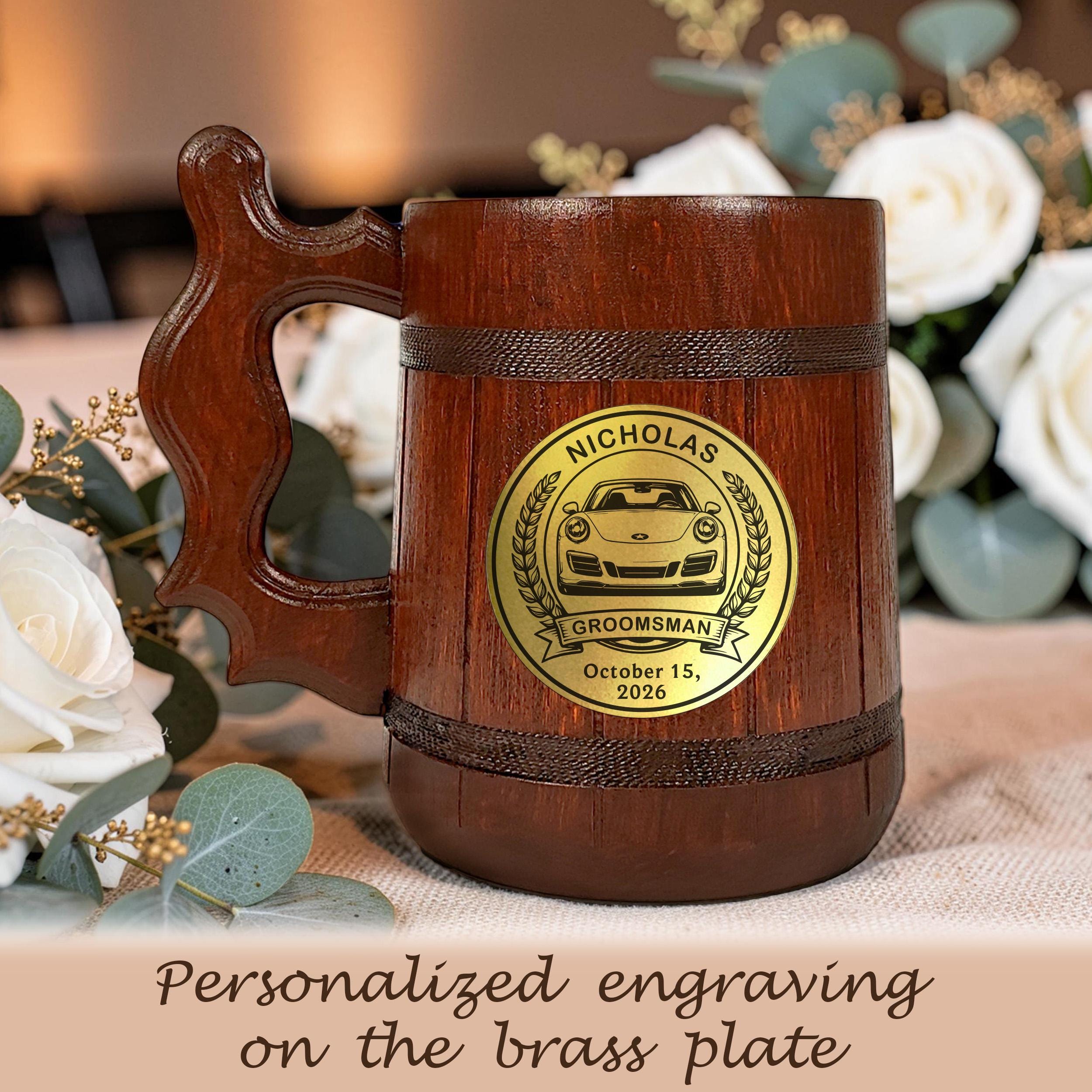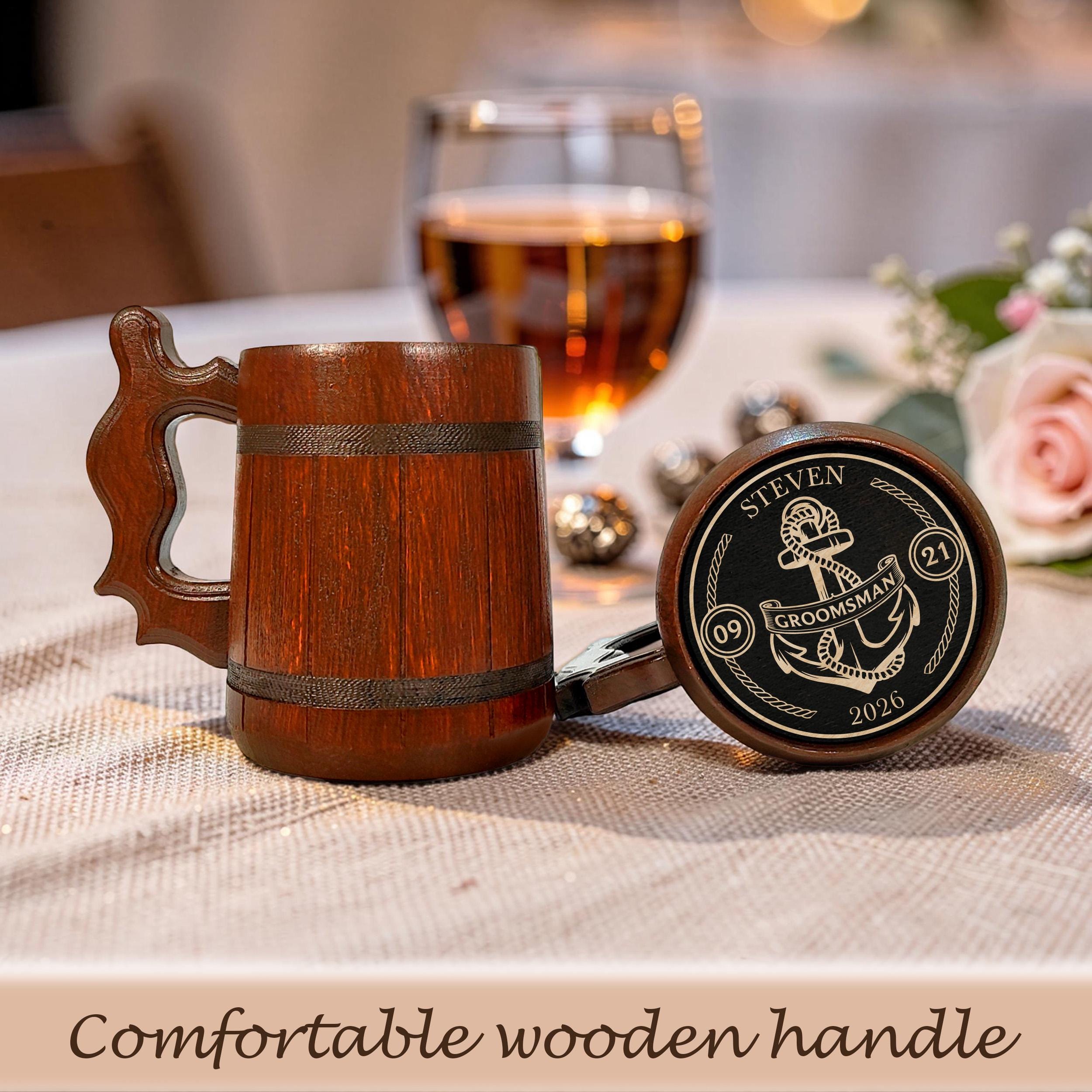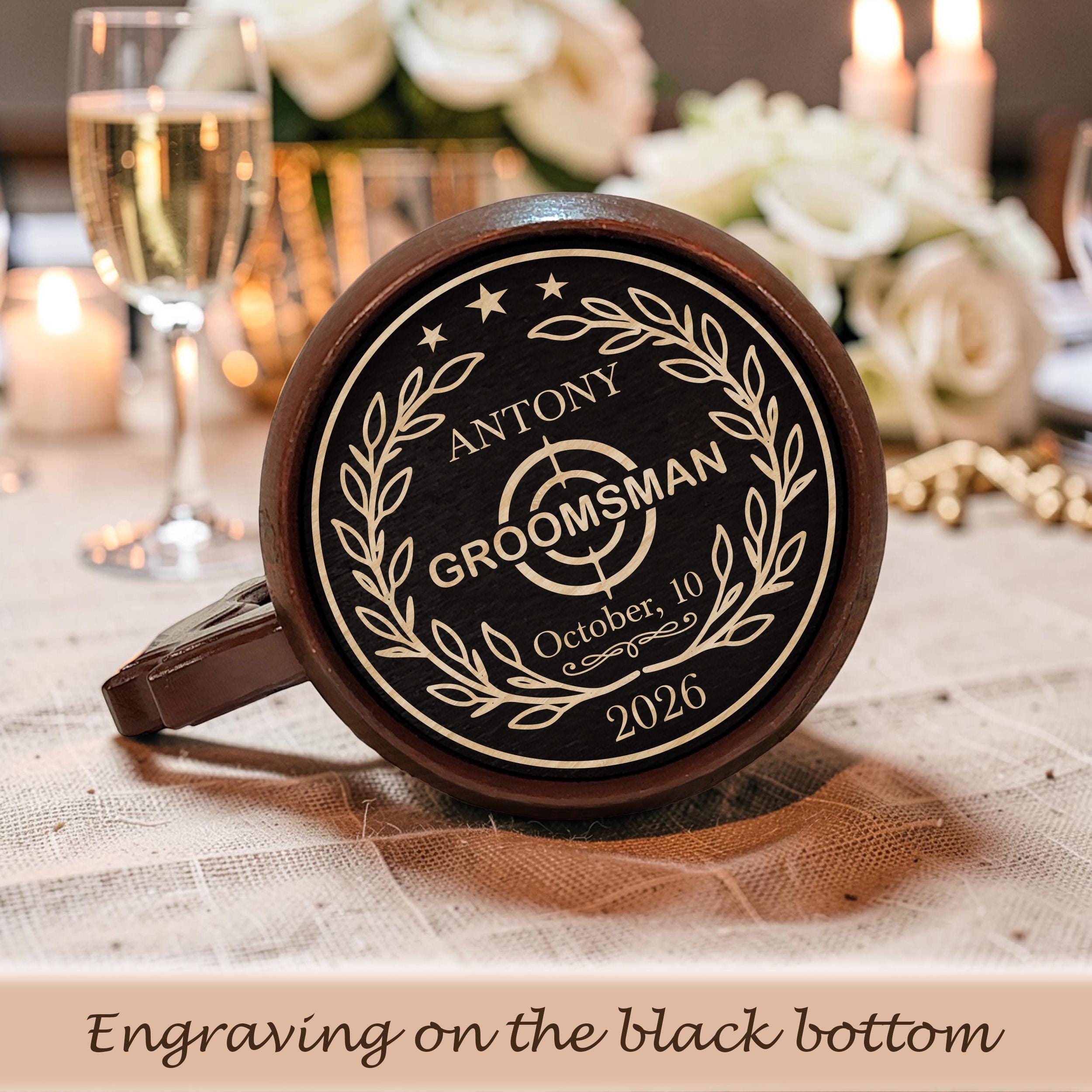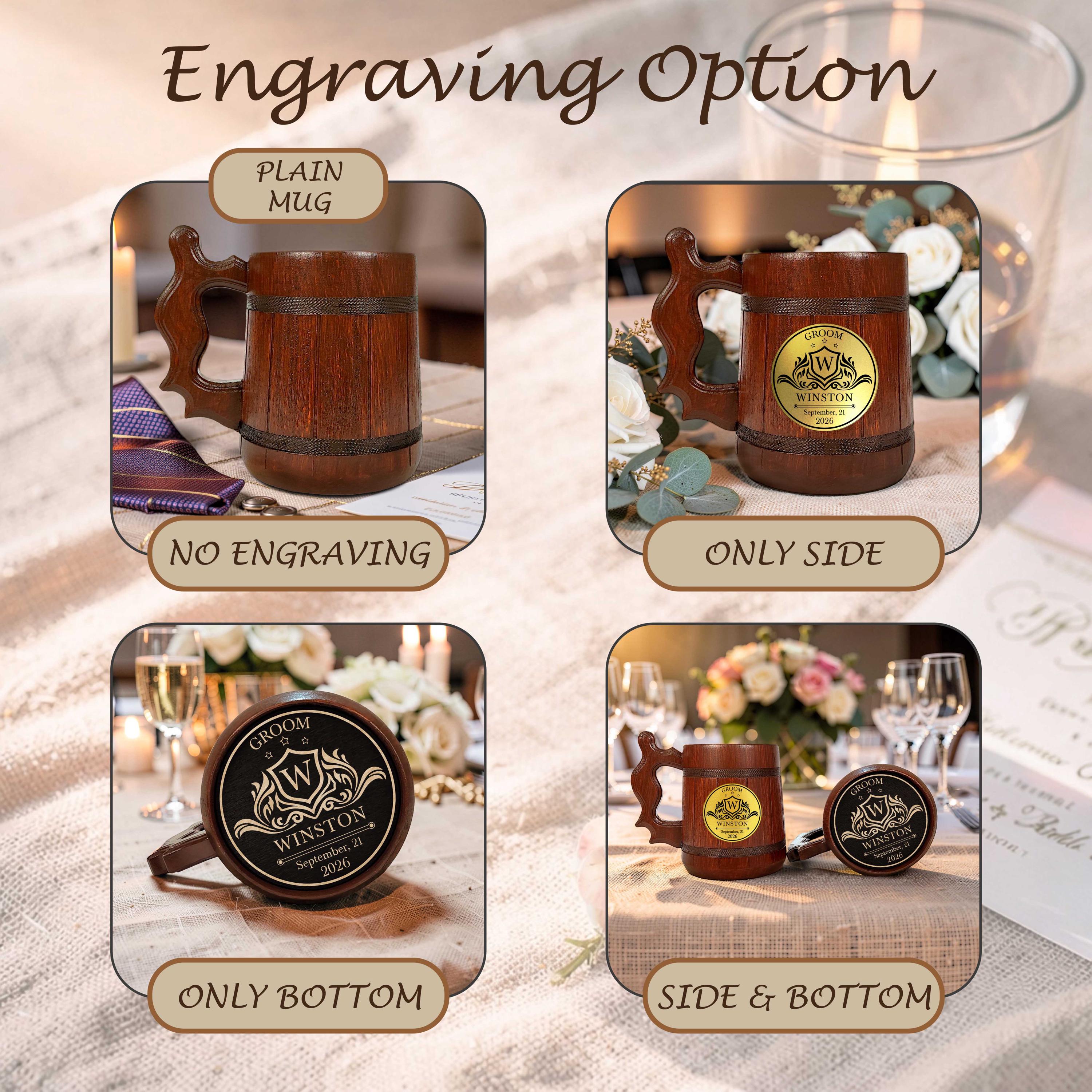 Toast your special day with a personalized red oak beer stein—a memorable gift for best men, best man, or groomsmen at weddings and bachelor parties. Each stein features a classic design and is customized with your name/initials, role (best man/best man/groom), and date. Choose your engraving location (side, bottom, or both) to create a unique wedding favor your friends will actually use.